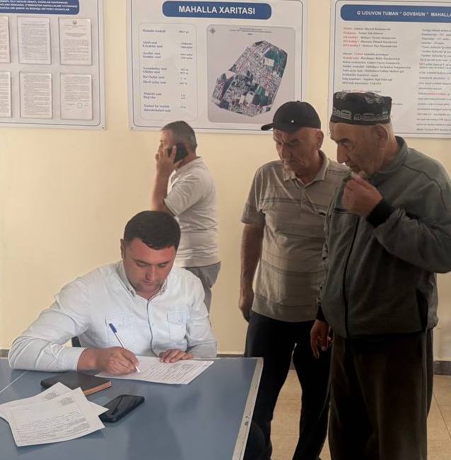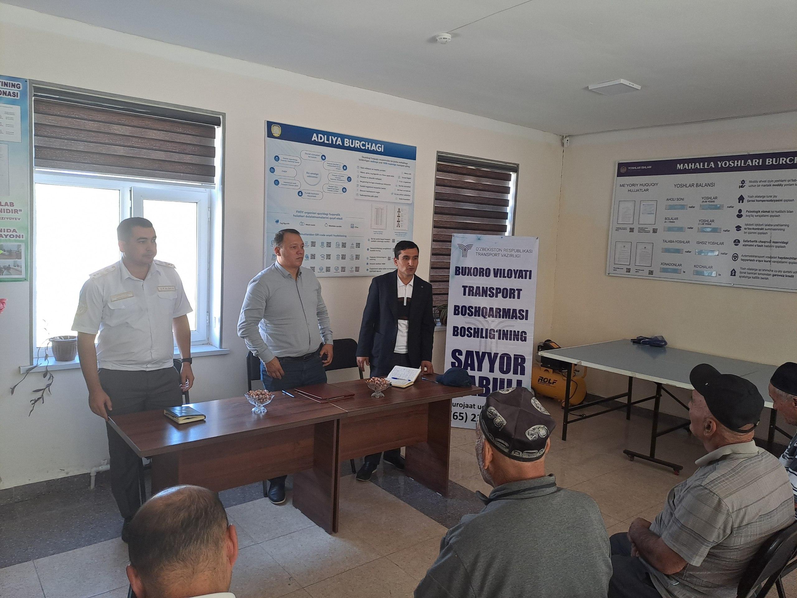 Avval xabar berilganidek, bugun, 19 sentyabr kuni Transport vazirligi, viloyat Transport boshqarmasi va Transport nazorat inspeksiyasi Avtomobil va suv transportida nazorat Buxoro viloyat hududiy bo'limi mas'ullari tomonidan mahallarda aholi muammolarini o‘rganish va hal etish, bandligini ta’minlash va kambag‘allikni qisqartirish, shuningdek aholi bilan to‘g‘ridan-to‘g‘ri muloqotni kengaytirish, ularni qiynab kelayotgan mavjud aniqlab, tezkorlik bilan bartaraf etish maqsadida G'ijduvon tuman G'ovshin MFY da fuqarolar sayyor qabuli o'tkazildi.
